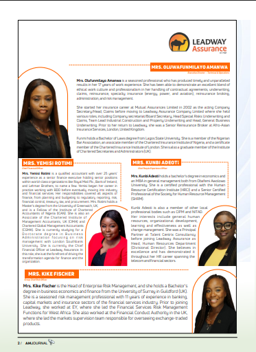 • Women in Leadership Spotlight: This issue highlights several high-impact women executives shaping the insurance and financial services sectors across Africa and beyond. From Mrs. Olufunmilayo Amanwa’s track record in specialty insurance to Mrs. Yemisi Rotimi’s international finance expertise, the journal profiles seasoned professionals with powerful stories and impressive credentials.